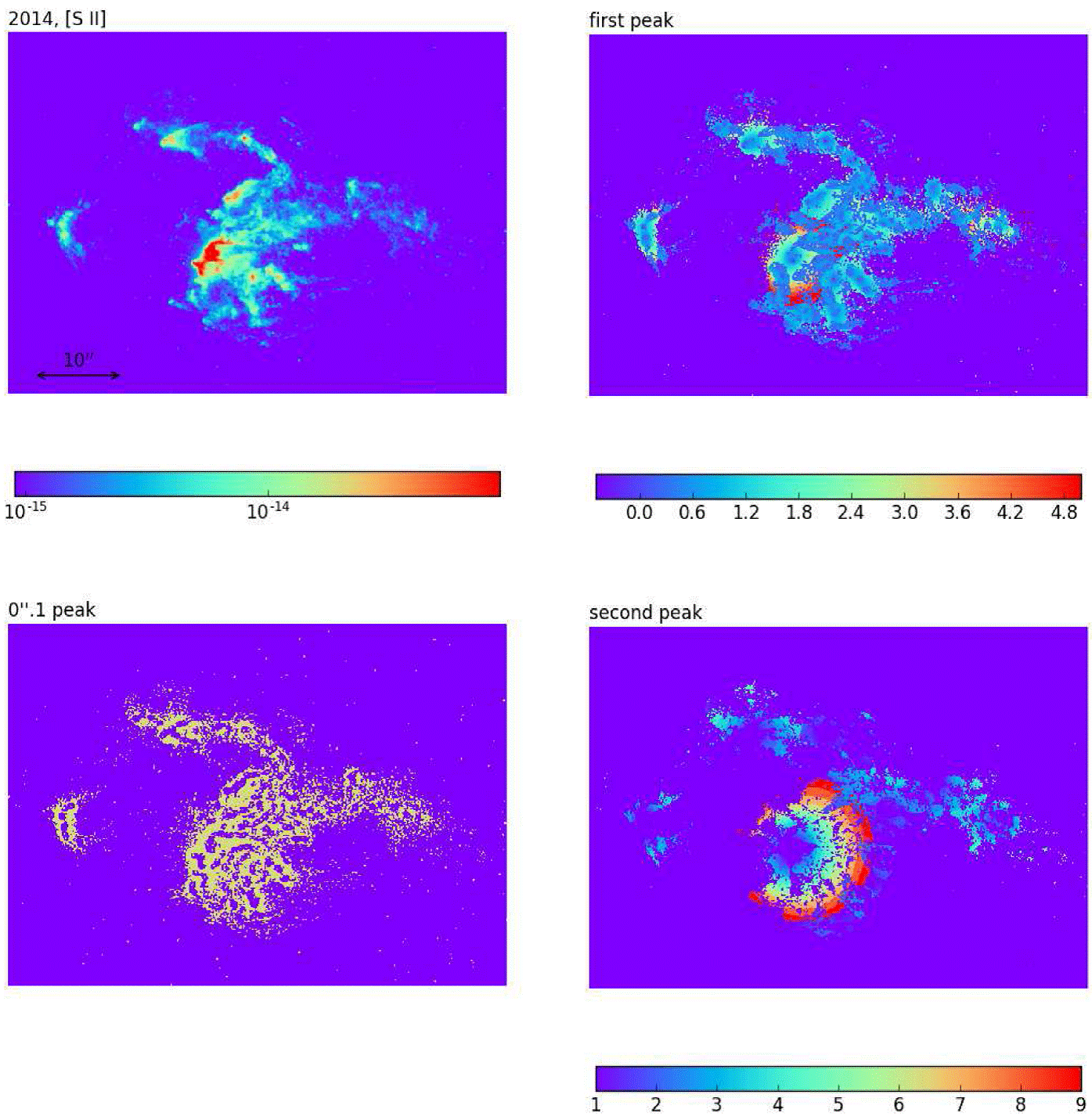 We convolved the four epochs of [S II] and Hα images (see § 2 and Table 1) with “Mexican hat” wavelets of radii σ = 1 to 100 pixels (i.e., 0´´.1 to 10´´). For all of the pixels of position (x,y) with an emission flux larger than Ic = 1.5 × 10-15 erg s-1 cm-2 arcsec-2 we computed the wavelet spectrum Sx,y(σ) (i.e., the intensity of the pixel as a function of radius σ of the wavelets).