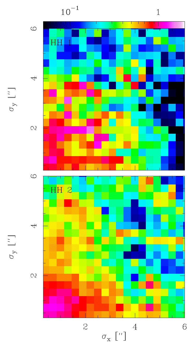 We then convolve the 2014 Hα images of HH 1 and 2 with 2D wavelets with σx and σy from 1 to 61 pixels (0´´.1 to 6´´.1). In the resulting four-dimensional spectrum (with axes x, y, σx and σy), for all the spatial pixels (x,y) with Hα intensities larger Ic = 1.5 × 10-15 erg s-1 cm-2 arcsec-2 we compute the wavelet spectrum Sx,y(σx,σy). For all these pixels we find the positions (σx,σy)m of the two peaks with smaller . Finally, we compute normalized 2D distribution functions f2D (σx , σy ) of the determined peaks (using a 2D version of equation A6).