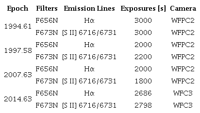 The characteristics of the four epochs of Hα and red [S II] images which are available in the HST archive are summarized in Table 1. The 1994 images were described by Hester et al. (1998), the 1997 images by Bally et al. (2002), the 2007 images by Hartigan et al. (2011) and the 2014 images by Raga et al. (2015a, b).