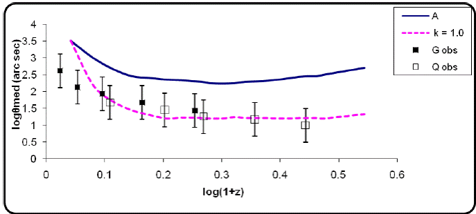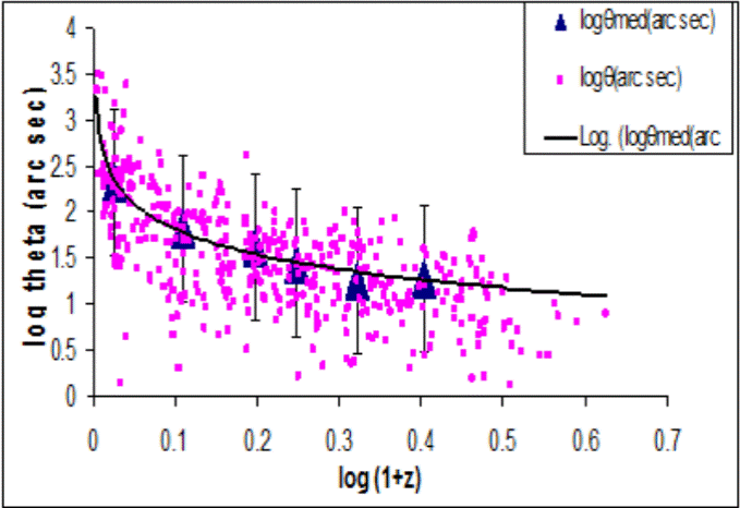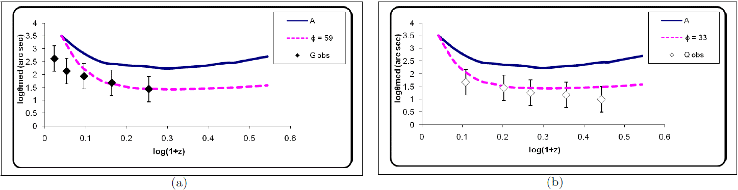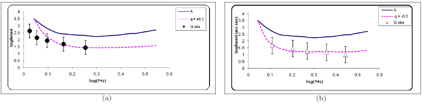 It could be seen that fairly good fits to the data can be obtained for q = 0.3 and −0.5, shown with the dotted line in Figure 6a and 6b respectively for radio galaxies and quasars. Thus, the observed θ − z data of EGRS can be explained in terms of the standard cosmological model by temporal evolution independent of a linear size evolution effect, which implies that radio galaxy and quasars are essentially derived from the same parent population, which evolves with the same amount of temporal evolution.