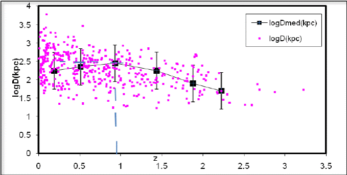 where D0 is the intrinsic linear size and depends on the assumed cosmology. To investigate the D − z data of the sample in the context of the inflationary universe, the scatter plot of D as a function of z is shown in Figure 2. The plot of median value data in six redshift bins is superimposed on the figure. It can be deduced from the median value data in Figure 2 that on average, the linear size increases with increasing redshift up to a value logDc = 2.5kpc (Dc = 316.23kpc) at zc = 1, after which it decreases with increasing redshift. This can be interpreted to mean that the present data is consistent with the inflationary model of the universe (Ω0 = 1). The regression analyses yield: logD=2.37kpc+0.003logP(WHz−1), with r = 0.04, and log D = 2.67 kpc −1.59 log P (WHz−1), withr≈−0.6forz<1andz≥1respectively. The median values give a stronger trend with correlation coefficients of +0.95 and −0.90 for z < 1 and z ≥ 1 respectively. The regression analyses for the D − z data yield: log D = 2.55 kpc + 0.09 log (1 + z), with r ≈ 0.12 and logD = −1.59kpc +2.67log(1 + z) with r ≈ −0.5, for z < 1 and z ≥ 1 respectively. Using Equation (4) in (1) yields,