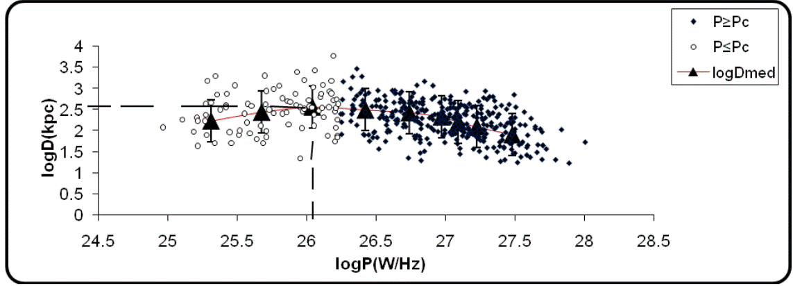 For a more homogenous source sample, the linear sizes of extragalactic radio sources have been suggested to separately depend on redshift and luminosity according to equations (4) and (6) respectively.
