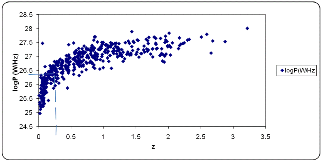 The P −z plot of the sample is shown in Figure 5. It can be observed that the plot shows a steep change in the P −z slope at log Pcrit = 26.33 WHz−1 around z ≈ 0.3. This Pcrit is the value of P in Figure 4 that corresponds to Dc at zc ≈ 1. The fact that the Pcrit value is consistent with zc ≈ 1 suggests that P − z of the present sample is obtained by assuming Ω0 = 1, on the supposition of an inflationary universe. In effect, luminosity - dependent linear size evolution is envisaged. In the light of the above, the evolution parameter, k is therefore expected to be a function of both linear size evolution and luminosity selection effects. Hence, the linear size evolution of extragalactic radio sources can be written as a function of both redshift and luminosity in a general form (Kapahi, 1989; Ubachukwu, 1995) as