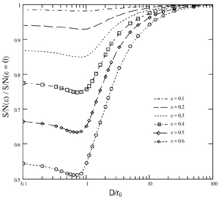 where I0, Iε, are the final (telescope + atmosphere) PSFs and d0, dε are the optimal “image sizes” for circular (ε = 0) and annular apertures, respectively. The results are presented in Figure 3. In these calculations the coefficient in (13) is dropped in order to isolate the influence of the effective area reduction. Here again curves reach less pronounced local minima at D/r0 ≈ 0.67 (σφ ≈ 0.72 rad) and then asymptotically approach the levels corresponding to the seeing-free (D/r0 << 1) case.