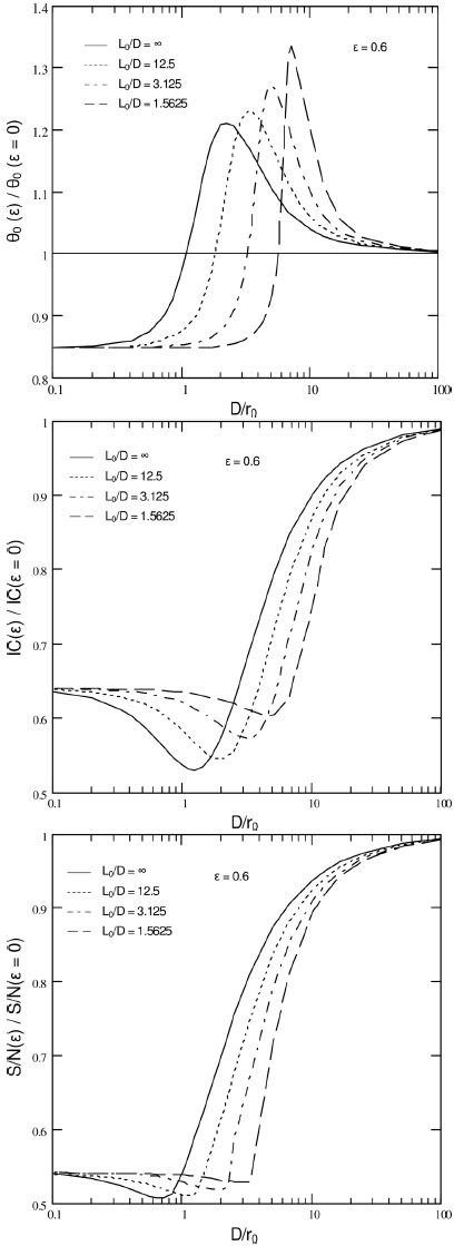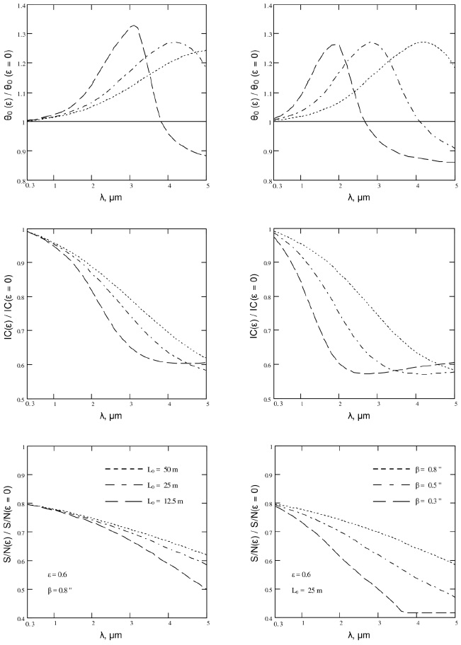 The presence of a finite outer scale, L0, shifts the extrema towards bigger D/r0 values. As the L0/D relation decreases the angular resolution at the extremal point continuously deteriorates up to ≈ 34% for L0/D = 1.5625 and ε = 0.6. (Figure 4). Meanwhile, the IC and S/N become slightly less degraded. For instance, under a 0.8” seeing and L0 = 25 m, maximum deterioration of resolution for telescopes with D=2,4 and 8m will be at λ≈1.84, 2.9 and 4.16 μm respectively.