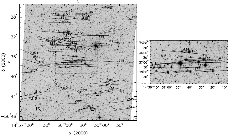 Figure 1 shows the projections of the polarization vectors in the V -band on the sky at the central region of NGC 5662, their lengths being proportional to the percentage of the polarization (PV) and their respective orientations given by the polarization angles (θV). The dashed line superimposed on the figure is the projection of the galactic parallel b = 3.°27, which is inclined at approximately 67º in this region. It can be seen that most of the stars of the sample have their polarimetric vectors non-aligned to the projection of the Galactic Plane (hereafter GP), indicating that dust grains and the magnetic field in the direction to the cluster have been recently disturbed (Ellis & Axon 1978). If we do a thorough review of Table 1, only the polarization angles of four stars of the sample (#104, #106, #136 and #143) show an alignment with the GP; three of them are identified as members by CLB.