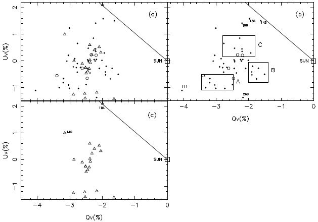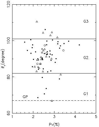 Figure 2 displays the relation between θV and PV for the 73 stars. Full circles indicate the members, triangles the non-members and open circles the stars without membership data. The memberships are assigned according to CLB, and the dashed line represents the inclination of the GP in the region (67º). An apparent segregation of three different groups is observed at the polarization angles, but not in polarization. The range of polarization angles in the total sample is spread over 44º.