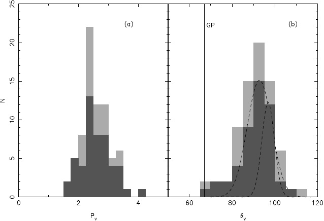 Figure 3b displays the distribution of the polarization angle in the V filter (θV) for all the stars. The solid line in the figure indicates again the inclination of the GP. In the corresponding distribution of members (dark bars) two groups may be observed with a small difference between their averages of the angles of polarization. If a Gaussian is fitted for each of the groups, we obtain a mean value and a full width at half maximum (FWHM) of 92º.8 and 8º.13 for the group on the left and 96º.9 and 4º.17 for the group on the right. The difference of more than 5º in the mean polarization angles is probably due to the existence of dust with different grain orientations. The angle distribution of the member stars (black bars) has a behavior similar to the total sample (grey bars). In principle, we think that stars with angles smaller than 85º could be identified as probable non-members; several of them were considered as members by CLB. This is observed through the Gaussian fit on the left, where the stars with angles smaller than 85º have a very low probability to be members; so these stars do not share the polarimetric properties of the member stars.