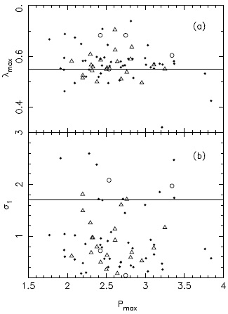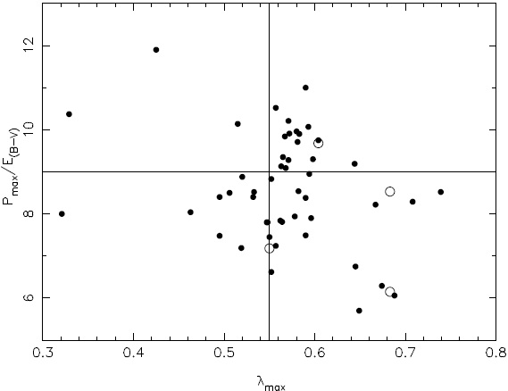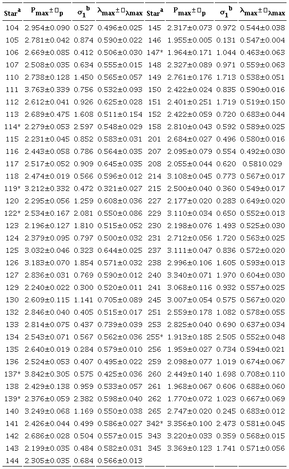 Figures 4a, b show Pλmax versus λmax (Panel a) and Pλmax versus σ1 (Panel b), respectively. The full line represents the limit values for both parameters to consider a likely candidate for intrinsic polarization. A few stars of the sample have, in Panels a and b, suspicious λmax and σ1 values and only eight of them have values much higher than the established levels for these parameters. In Table 2 these stars are indicated with a star symbol in Column 1.