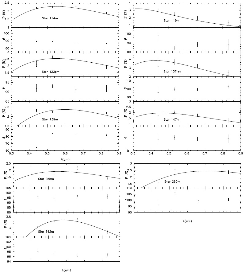 Stars #114, #122, #139, #255, #342 have extreme values of σ1 and stars #119, #137, #147 have a λmax value of less than 0.55 μm. To complete the analysis we plot in Figures 5a, b polarization and angle versus the wavelength for each of the eight stars mentioned, including the fit of the law of Serkowski with a full line. The stars that present a suspicious σ1 parameter show in general good adjustment to Serkowski. A different case is star #139, which according to Fitzgerald et al. 1979 it is a B8IV(II/III), showing a rotation of the measured polarimetry in the B filter, a result that is fully expected for stars with extended atmospheres. Considering the three stars with the lowest values of λmax, the member star #119 displays a bad adjustment to Serkowski with a polarization that decreases with the wavelength. Also rotation is observed with variations in the polarization angle of up to about 15º. For this star only photometric data (CLB) are available in the literature, but this type of behavior in polarization and in orientation angle was found in other studies for the case of binary systems (Vergne et al. 2016).