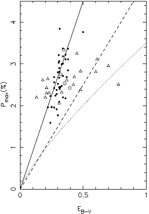 Figure 7 shows the polarization efficiency for the stars on the region of NGC 5662. The empirical limit to the efficiency of the ISM, given by Serkowski et al.(1975)Pλmax = 9 EB−V, is represented by a continuous line in the figure. The polarization efficiency of the ISM in general is given on average by Pλmax = 5 EB−V, according to the plots of Serkowski et al. (1975). This is shown by a dashed line; the dotted line represents the average polarization efficiency of the ISM estimated by Fosalba el al. (2002), being valid for EB−V < 1.0 mag. Excesses EB−V of the stars were obtained from CLB and from the relation between spectral type and color indices following Schmidt-Kaler (1982).