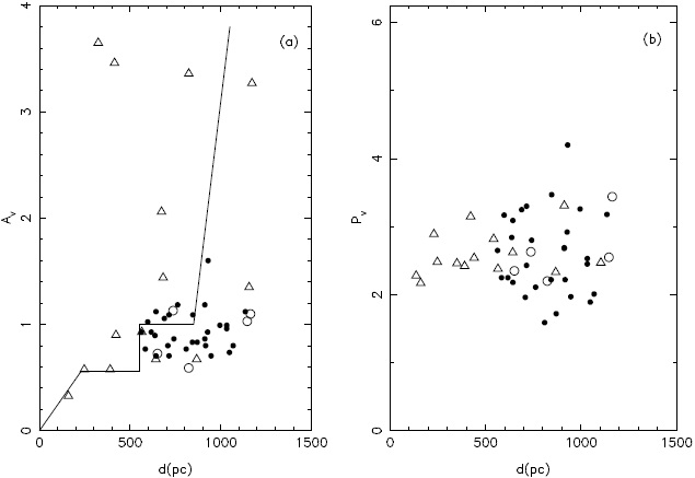 Figures 9a and b show the evolution of the absorption and the polarization, respectively, for the observed stars for which we have been able to estimate distances in the region of NGC 5662.