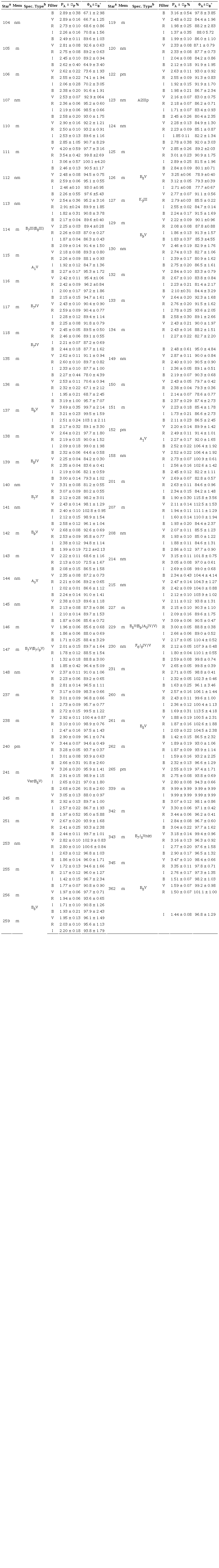 Several standard stars for null polarization and for the zero point of the polarization position angle were measured in all the filters (BV RI) for calibration purposes. HD115617 (null polarization standard) and HD111613 (an angle standard) were measured at the beginning of every night of the run. At the end of each night a second check-up was carried out, observing HD209100 (null polarization) and HD203532 (angle standard). This process was repeated every night of the observing run in all filters used. The null standards show that no correction for instrumental polarization has to be done, because errors in polarization were greater than the polarization measured. Errors are dominated by the photon shot noise and were handled as described by Maronna et al. (1992). For the program stars, the sky’s polarization was measured in a region close to object in each filter and subtracted. The polarization angle was corrected to the equatorial system using the observations of angle standards. Time exposure was done in cycles of 240 sec and several cycles were used for the faint stars.