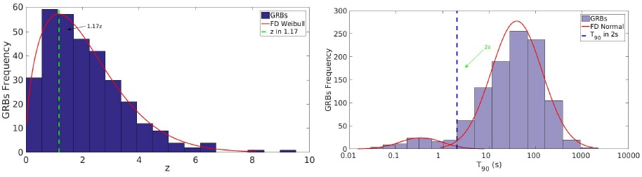 Figure 1, the histogram of frequency distribution of 333 long-GRBs over redshift shows a Weibull distribution with a mode at z ≈ 1.17 and a mean at z ≈ 2.06. these values match the observational results of SFR, considering that at z ~ 2.5, about 10% of all stars were formed and about 50% of the local universe star formation took place at z ~ 1, Schneider (2015).