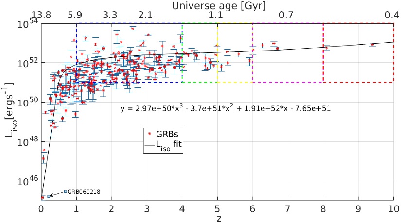 In Figure 2 we present the luminosity distribution of our sample made up by 263 long-GRBs. Here we observed the relation between (Liso) with redshift considering that only highly luminous GRBs can be seen at high z, using a luminosity boundary of Liso > 1051ergs−1 established by Kistler et al. (2008). The spatial distribution of the events is shown in 5 redshift bins 1−4,4−5,5−6,6−8 and 8 − 10, where we will calculate the SFR.