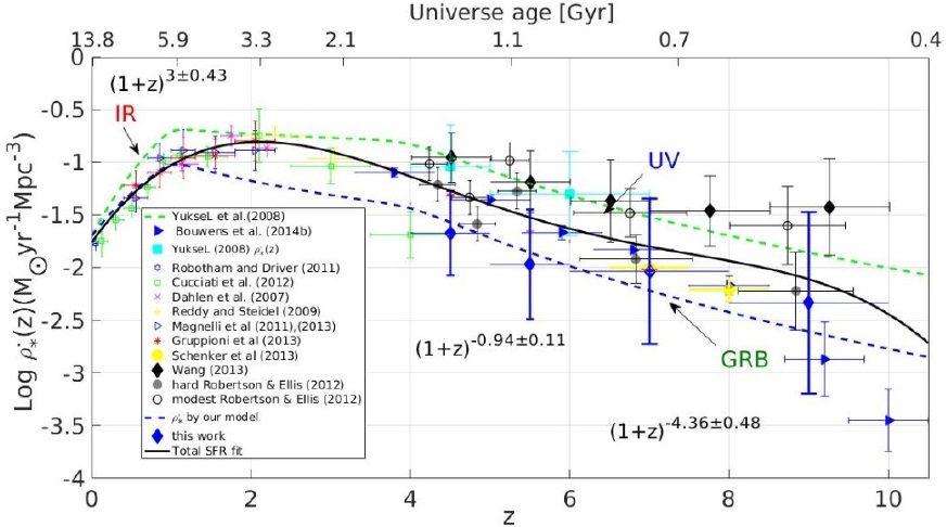 Based on the results of the statistical analysis we calculated the density and the average density . In Figure 3 and 4 we compare the results with the ones obtained by traditional tracers summarized by Madau & Dickinson (2014).