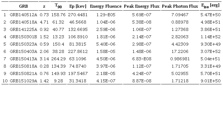 Table 1 presents 10 elements of the sample, listing some spectral properties such as Energy Fluence2, Peak Energy Flux3, Peak Energy Flux4Eiso, Ep and T90. Using Eiso we can obtain the isotropical luminosity Liso by equation 2