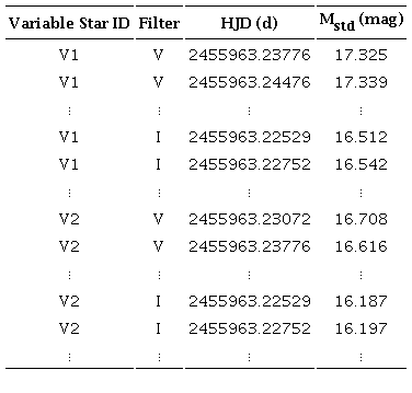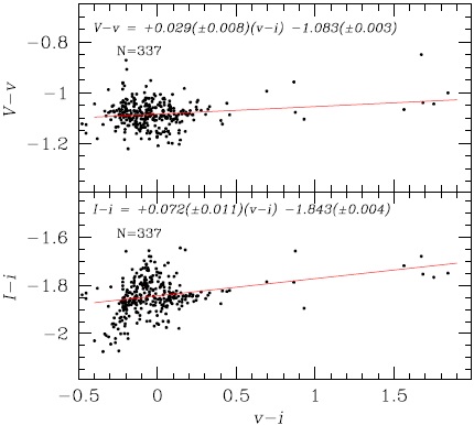 From the standard stars of Stetson (2000)2 in the field of NGC 4147, we identified 337 stars in the FoV of our images, with V in the range 14.6-21.5 mag and V-I within 0.0-2.37 mag. These stars were used to transform our instrumental system to the JohnsonKron-Cousins photometric system (Landolt 1992). The standard minus the instrumental magnitude differences show a mild dependence on the colour, as displayed in Figure 1. The transformation equations are given in the corresponding panel of Figure 1. The resulting VI photometry for all variables in our FoV is published in Table 2 which is an extract from the full table, available in electronic format. The corresponding data from 2003 (AF04) can be found in the CDS web site.3