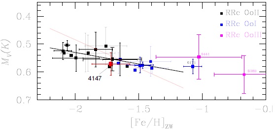 The dependence of the HB luminosity on the metallicity of a globular cluster is now a well known fact from theoretical and empirical investigations made during the 1990’s, (e.g. Lee, Demarque & Zinn 1990, Walker 1992, Carney et al. 1992, Sandage 1993, Chaboyer 1999). In a recent paper (Arellano Ferro, Bramich & Giridhar 2017) we have studied the MV -[Fe/H] relation for families of Oo I and Oo II groups in a homogeneous way, from the results of the Fourier decomposition of the RR Lyrae light curves. We found that the slope of the relationship obtained from RRab stars is significantly different from that of the RRc stars. In Figure 10 we reproduce the MV -[Fe/H] relation for the RRc stars and place NGC 4147 using our present results for the average MV and [Fe/H]. These values are consistent with the family of Oo I clusters and do follow the general trend defined by the results from the RRc stars. Note the greater slope of the relationship when calculated from RRab stars (red line in Figure 10) determined by Arellano Ferro, Bramich & Giridhar (2017).