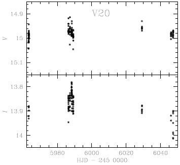 While this paper was in press, a further inspection of the light curves of five bright RGB stars revealed the variable nature of one of them, which we have now identified as V20 and classified it as SR. The V and I light curves are shown in Figure 11. The position on the CMD of V20 and the other four bright giants investigated but found to be non-variables are also shown in Figure 7.