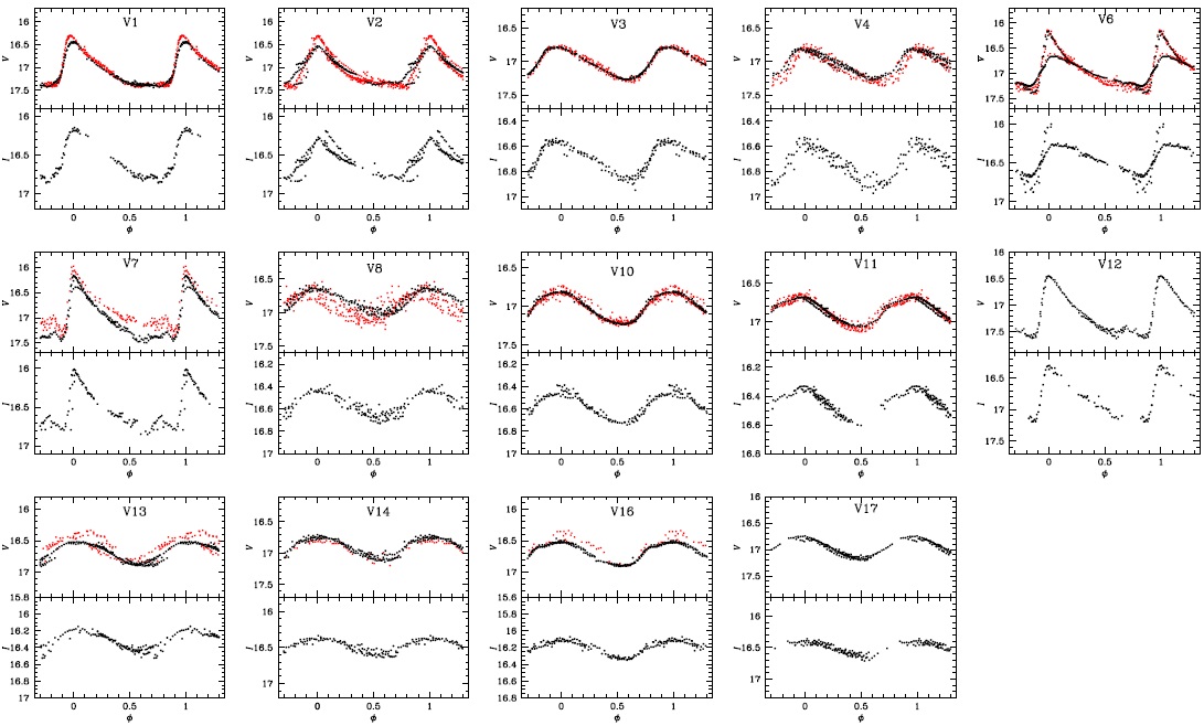 V13. This RRc star was noted by AF04 to show amplitude modulations. SCS05 in their investigation calculated a period of 0.408319d but commented that the resulting light curve is somewhat noisy. Combining AF04, SCS05 and the present paper data we found a period of 0.408318d, in excellent agreement with that of SCS05. The resulting phased V and I light curves are shown in Figures 2 and 5. In the latter we include the V data from SCS05. The V light curve displays amplitude and phase displacements. It has been suggested by SCS05 that these erratic phasing may be the consequence of interference of fundamental and first overtone pulsation modes but they failed to identify the two modes. An alternative explanation might be the interference of two modes of very similar frequencies, and at least one of them being non-radial, similar to the case of V37 in NGC 6362 (Smolec et al. 2017; Arellano Ferro et al. 2018). Detecting the two frequencies requires dense high quality observations that are not presently available for V13. Possible light contamination by an unseen companion also cannot be ruled out.