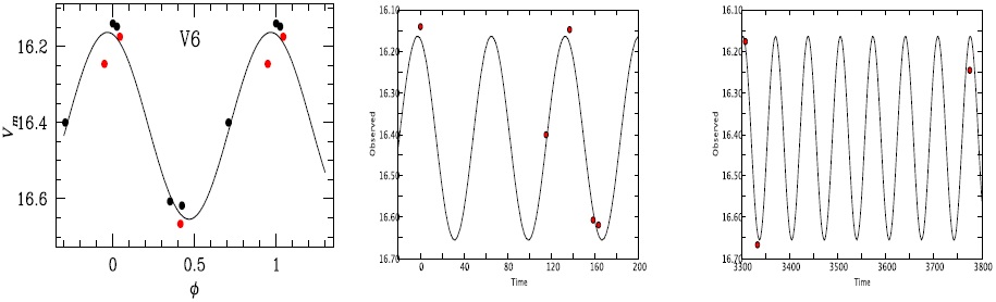 V6. This RRab star has pronounced Blazhko amplitude modulations. Analysing the magnitude at maximum light Vm variations, AF04 estimated a likely Blazhko period of about 67.9d. In the present data we have identified three more times of maximum. In Table 6 we list the times of maximum and their corresponding magnitudes Vm. The Vm modulations are shown in first panel of Figure 4. We calculate a periodicity of 67.46d which agrees very well with the original estimation of AF04. In the central and right panels one can see that the sinusoidal model with P = 67.46d does fit the Vm modulations very well.