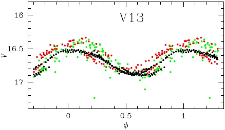 V12. In the paper of AF04 the V light curve is rather incomplete but shows a very large amplitude, likely due to the presence of four spurious data near minimum light. The light curve of SCS05 is of smaller amplitude with a flat bottom, attributed by SCS05 to the possible presence of an unseen companion. In the present paper the V light curve (Figure 2) is clean and complete, with an amplitude similar to that of SCS05. A comparison of all available data suggest some small amplitude modulations. The intensity weighted colour from our data is 0.340 and in the CMD (Figure 7) the star falls in the inter-mode region. The colour from SCS05 is 0.48 which moves the star to the fundamental mode region. Given the uncertainties in the colour estimates of this peculiar star, we chose to omit it in the discussion involving the RRab-RRc distribution in the instability strip.