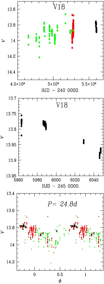 V18. This is the brightest star in the field of the cluster near the central region. The star was classified by AF04 as a possible RRc and later discarded as variable by SCS05, who considered the star to be a bright red giant but failed to find a convincing variability. We have reconsidered the case employing the historical data of SCS05 taken between 1983 and 2003 by an assortment of instruments, the data from AF04 taken during 24 nights between January and July, 2003, and the data of the present paper taken in 2012 as detailed in Table 1. In Figure 6, the top panel shows the long-term brightening of the star, while the panel in the middle shows the clear dimming in 2012. This demonstrates beyond doubt the variable nature of the star. The question now arises is whether the star is periodic and if so then what the period might be. We have performed a series of tests for several data blocks and found that the AF04 and 2012 data are well phased by a period of about 46.1d; the combination of all available V data suggests about half that period, 24.8d. The bottom panel shows the light curve phased with this period.