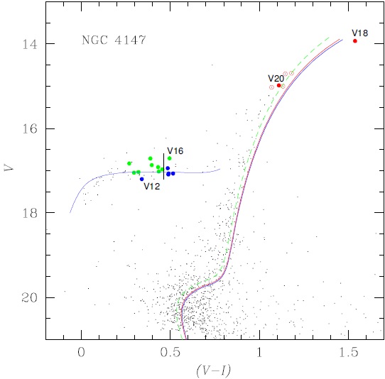 The age of NGC 4147 has been estimated via a differential approach by De Angeli et al. (2005) as 12.23 Gyr. On the other hand, SCS05 have argued that the ages of M3 and NGC 4147 are virtually identical. For M3 De Angeli et al. (2005) estimated 12.0 Gyr. We have adopted 12.0 Gyr with the aim of overplotting an isochrone on our CMD.