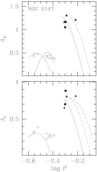 NGC 4147 has been considered as an Oo I type cluster in spite of its low metallicity and of the rather large fraction of RRc stars, Nc /(Nc + Nab) = 0.67, typical of Oo II clusters. The reason for this is the low average period of its RRab stars, = 0.524 ± 0.048 d, which unfortunately is based only on its five known RRab stars. The period-amplitude plane, or Bailey diagram, for NGC 4147 is shown in Figure 8 in the VI-bands. The details are given in the caption. Given the low number of RRab stars and their strong amplitude modulations, it is not possible to decide from their distribution whether they are confined preferentially towards the Oo I locus defined from the M3 globular cluster (Cacciari et al. 2005). The distribution of RRc stars is more suggestive and displays a dual distribution about the loci for Oo I (red parabola) and Oo II (black parabola). This reminds us of the distribution for NGC 6402 (Contreras Peña et al. 2018; their Figures 9 and 10) for which arguments in favour of being an Oo-Int cluster were offered.