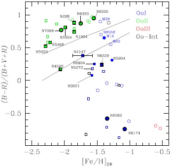 Another interesting feature of NGC 4147 is its HB structure parametrised by the quantity ℒ=(B−R)/(B+V +R)with B, V, R, representing the number of stars on the HB to the blue, inside and to the red of the instability strip. Figure 9 displays the positions of Galactic globular clusters on the ℒ-[Fe/H] plane. The different Oosterhoff types are indicated. Similar versions of this figure have been used to illustrate the Oosterhoff dichotomy in Galactic globular clusters, which is not present in extragalactic clusters and spheroidal galaxies (e.g. Bono et al. 1994, Catelan 2009, Contreras Peña 2018). The upper and lower limits of the Oostherhoff gap are shown by the solid lines in the figure calculated by Bono et al. (1994). This region is mostly populated by extragalactic systems, for instance those listed in Table 3 of Catelan (2009). For the sake of clearness we only display Galactic globulars in Figure 9.