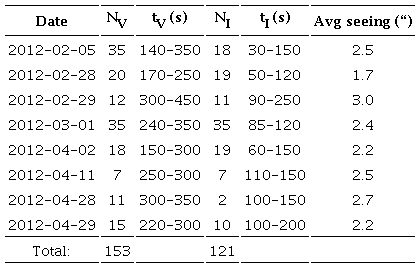 The CCD observations in the Johnson-KronCousins VI-bands used in the present work, were obtained between 5 February and 29 April 2012 with the 2.0m-telescope at the Indian Astronomical Observatory (IAO), Hanle, India, located at 4500 m above sea level in the Himalaya. The detector was a SITe002 CCD of 2048×2048 pixels with a scale of 0.296 arcsec/ pix, translating into a field of view (FoV) of approximately 10.1×10.1 arcmin2. Our data consisted of 153 V and 121 I images. Table 1 gives an overall summary of our observations and the seeing conditions.