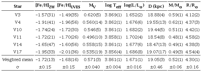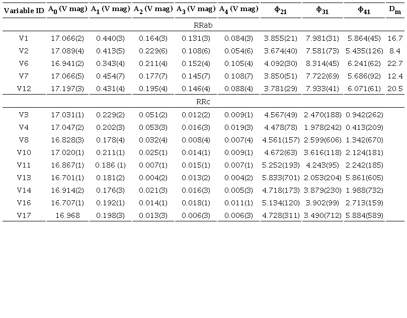 The calculation of the physical quantities is very sensitive to the morphology of the light curve and spurious results can be obtained if light curves with peculiarities are considered, for example those with amplitude and/or phase modulations, or cases of incomplete light curves. In particular, for the calculation of [Fe/H] in RRab stars, Jurcsik & Kovács (1996) and Kovács & Kanbur (1998) have defined a “compatibility parameter” Dm which should be smaller than 3.0 if the light curve under analysis is consistent with the calibrators used to establish the Jurcsik & Kovács (1996) iron abundance calibration. In the present case we note that all five known RRab stars show amplitude variations, and their Dm values are all very large (Column 10 in Table 4), hence they are neither fit for [Fe/H] calculation nor for a distance estimation, since the absolute magnitude depends on the amplitudes of the first and third harmonics (Kovács & Walker 2001). Thus, they were ignored. Likewise, some peculiar RRc stars with erratic phasing (V8, V13 and V16) were also not included in the physical parameter calculations.