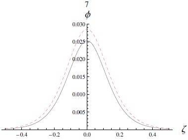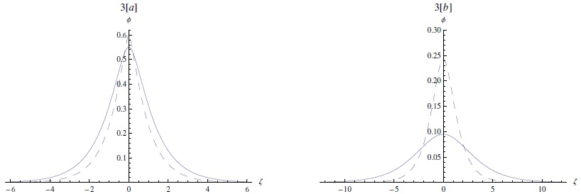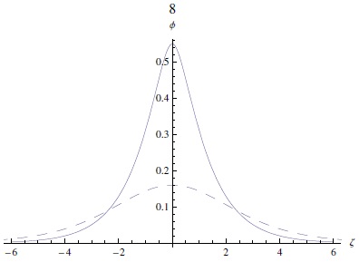 Note that increasing the electron-to-ion temperature ratio σ = Te/Ti as well as the parameter κ will decrease the amplitude (as in Figure 6), while we can see in Figure 7 the effect of increasing the ion-to-electron number density ratio μi (which means a decrease of μd) which will make the soliton taller and wider. We can now compare this analytical solution to the numerical solution (obtained by numerical integration) of equation (6), in Figure 8. Note that the difference between the approximate and exact solutions increases with increasing nonlinearity, thus enhancing the amplitudes of pulses.