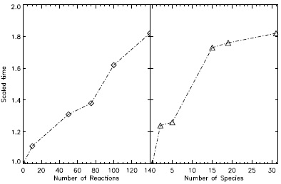 In the left panel of Figure 10 (and also in Column 4 of Table 4), we show the scaled computational time as a function of number of reactions. We have scaled the computational times to the computational time of a purely hydrodynamic simulation (model M1, with no chemical species). From these models (models M2a, b, c, d and e) we see an approximately linear increase in computational time with number of chemical reactions (left panel of Figure 10). For the case of 140 reactions (model M2e), the computational time is ≈ 1.8 times larger than that of the purely gasdynamic simulation (model M1, see Table 4).