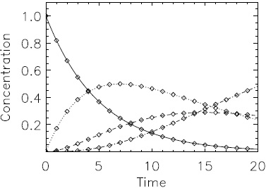 Figure 2 shows the densities of the species a, b, c and d as functions of time (in dimensionless units); the solid, dotted, dashed and dot-dashed lines, denote the na, nb, nc and nd densities, respectively and the diamonds the values calculated using the standard ACUCHEM code. The values obtained with our code are in very good agreement with the results obtained using ACUCHEM.