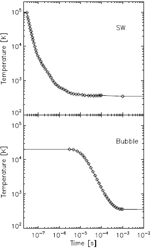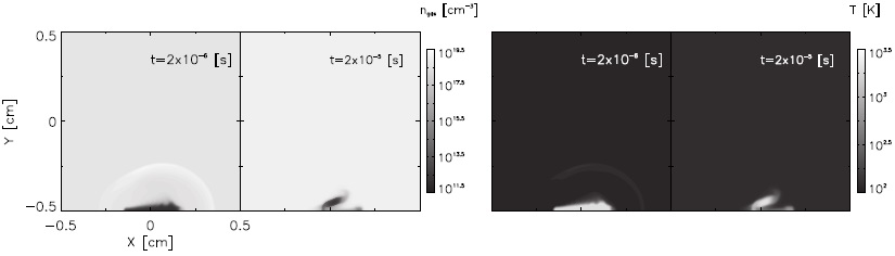 Figure 7 shows density and temperature maps for two stages of the bubble evolution. The two panels on the left correspond to density maps for evolutionary times of 2×10−6 and 2×10−5 sec, and the two panels on the right side are the temperature maps at the same two evolutionary times. At 2×10−6 sec, the gas which is compressed by the shock wave and a low density, inner region (with a temperature ≈ 104 K) are clearly seen. At 10−5 sec, the shock wave is no longer visible, and the central, low density region has a ≈ 1000 K temperature.