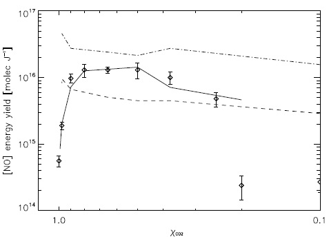 Figure 4 shows the number of molecules of nitric oxide formed by the laser pulse per unit energy (of the laser) versus the initial concentration of CO2. The dash-dotted and dashed lines are the final concentrations (after the 3000 pulses, see above) obtained for the plasma/hot air bubble (dash-dotted line) and for the shock wave (dashed line), and the diamond symbols are the experimental measurements (with their errors) for all of the gas (bubble+shock wave) presented by Navarro-González, McKay & Mvondo (2001a).