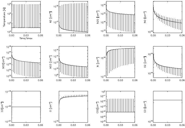 Figure 5 shows the evolution of the plasma temperature and numerical densities of N, N2, N2O, NO, NO2, NO3, O, O2, O3, CO and CO2 for the first 18 simulated pulses. The peaks in the plasma temperature correspond to the energy injection times (i.e., to the laser pulses, which are assumed to produce instantaneous temperature rises). The concentrations of N2, NO, O and CO2 increase and the concentrations of N, N2 O, NO, NO2, NO3 and O2 decrease in the pulses. The NO yield has a peak in each pulse, but after ≈ 1200 pulses it attains an almost timeindependent, constant value. This is the value that is compared with the experimental measurements.