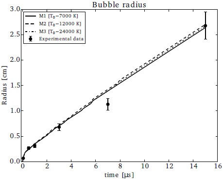 The numerical simulations are initialized with an environment of atmospheric pressure and a temperature of 300 K. A γ = 7/5, constant specific heat ratio is assumed. The hot plasma bubble (generated in the experiment in the focal region of a focussed laser pulse) is introduced in the center of the computational mesh, as a hot, T0 ~ 104 K cone of 0.25 cm (axial) length and α = 30◦ half-opening angle (the initial density within the cone having the environmental value, and the values chosen for T0 are discussed below). This high pressure cone expands, driving a shock wave into the unperturbed environment. The simulations evolve until a time of 2.0 × 10−5 sec.