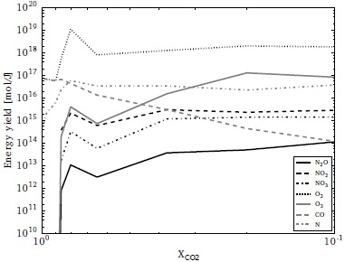 Finally, Figure 9 shows the total yield of all of the molecules included in the numerical simulations. We find that for initial CO2 densities larger than 0.865, N2O, NO2, NO3 and O3 do not form, but in environments richer in N2 the formation of these oxides is very important.