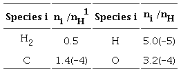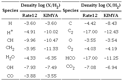 Taking into account these considerations, we obtain a network with 13 species (H, H+, CH, CH2, H2O, OH, CO, C, C2, O, O2, HCO, CO2) together with 146 reactions (including the formation in dust of H2). We must note that, according to these criteria, direct cosmic-ray ionization reactions, cosmicray-induced photoreactions and interstellar photoreactions are excluded. The reaction coefficients are set to zero outside the temperature range in which they are valid.