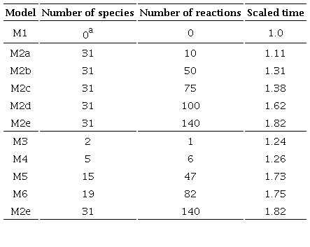 The numbers of species and reactions used in these two sequences of simulations are given in Table 4.