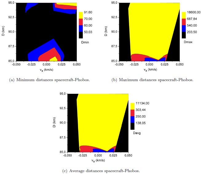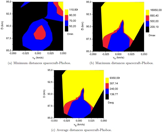 The first results are shown in Figure 2, which contains the maximum (Dmax), minimum (Dmin) and average (Daυg) distances between spacecraft and Phobos as a function of the initial conditions D (km), in the vertical axis, and υx (km/s), in the horizontal axis, for orbits when Phobos is at the periapsis of its orbit around Mars. The initial velocity υy was fixed as −0.02 km/s. This value, as well as the ranges for D (85 to 95 km) and υx (−0.05 up to 0.05 km/s) were selected after several preliminary simulations, made using three loops for the variables D, Vx, and Vy. After this sequence of loops, the solutions with lower maximum and average distances are selected for more detailed studies. Those simulations indicated the best values that generate orbits in the range desired in the present paper. To build this figure, a limit of Dmin > 50 km was imposed, to preserve the validity of the model that considers only the J2 term to represent the irregular shape of the bodies, and to avoid trajectories with high risk of collision. This type of plots is a new way to classify the orbits, compared to the existing literature. Each point in the plot represents one orbit, with initial conditions specified by the value of D (vertical axis) and υx (horizontal axis). From these plots it is possible to see the evolution of spacecraftPhobos distances and to choose an orbit. A strong correspondence between maximum and averaged distances among the orbits is noted, with the minimum values of both of them located at the same initial conditions. This happens because Dmin usually has small values, and they are also very similar to each other, so they do not much influence the average distances. The closest orbits are obtained for υx near zero. It is also noted that there is some symmetry around this line. The minimum values for the maximum distances have D below 91 km, where the orbit goes as far as 500 km from Phobos, but maintains an average distance in the range 140 − 240 km. Above this value there are few orbits that remain close to Phobos. Regarding the minimum distances, the values which are more interesting for the mission are the ones above 50 km, as mentioned before. Figure 2(a) shows that there are several ranges above 50 km, in blue (50 to 70 km), red (70 to 90 km) and yellow (90 to 110 km). Using this technique, we can find the orbits that have Dmin above 50 km and minimum Dmax, which is an interesting criterion to choose the orbits. Other options are available, like using specific values and/or ranges for maximum and/or average distances, etc. Those orbits are interesting to place a spacecraft when arriving at the system, because they are close enough to make preliminary observations, but far enough to avoid accidental collisions. It is clear that the bottom region around υx = 0 satisfies those two constraints, having Dmin > 50 km, Dmax < 500 km and Davg < 240 km.