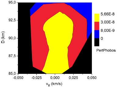 Figure 3 shows the values of the contribution of Phobos, in km/s2, assuming that Phobos is at the periapsis when the orbits start, e = 0.0151, = 0.105, = 1960.45 × 10−6, T = 30 days. The range goes from near zero to 5.66×10−8 km/s2. It is noted that these values are larger when υx is near zero, where the maximum and averaged distances are smaller, which is an expected result, since the force from gravity is inversely proportional to the square of the distance Phobos-spacecraft. The larger effects of Phobos keep the spacecraft at smaller distances from the moon, which clearly indicates the importance of this force to decrease the distance spacecraft-Phobos. The contribution of the J2 term of the gravity field of Phobos has a maximum of the order of 1.74 × 10-10 km/s2, so two orders of magnitude smaller than the contribution of the main term of the gravity field of Phobos. Using the same technique, the contribution of the Keplerian term of Mars is about 4.383 × 10-4 km/s2, six orders of magnitude stronger than the effects of Phobos, which confirms the fact that the orbits are really dominated by the gravity field of Mars, and just perturbed by Phobos. This is a basic fact of the QSOs orbits, but the present study makes a interesting quantification of the effects. The J2 term of the Mars gravity field contributes an increment of velocities of the order of 1.690 × 10−7 km/s2, which is three orders of magnitude smaller then the Keplerian term of Mars, but three orders of magnitude stronger than the J2 term of the gravity field of Phobos. It is also one order of magnitude stronger than the Keplerian term of Phobos. This study gives a very good and quantitative estimation of the contribution of each force involved in the dynamics.