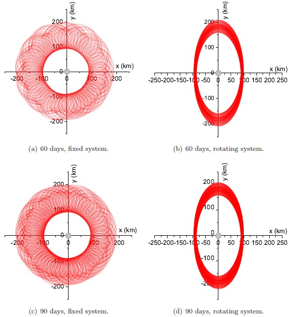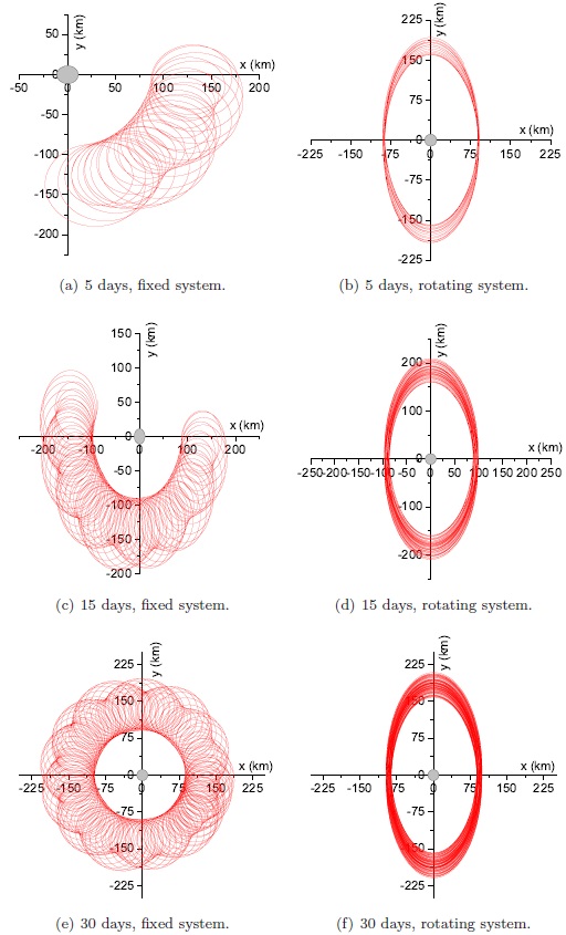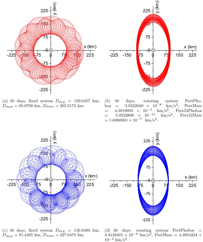 Figure 7 shows the first trajectory listed in Table 5 over 30 days, in the fixed and rotating reference systems. In all figures Phobos is considered to be at the origin of the reference system and its dimensions are presented in scale. Table 6 shows the values during the time evolution, just to confirm the stabilization of the parameters involved. The nomenclature is the same used in Table 4. For Figures 7(a) and 7(b) we have used the better model, while for Figures 7(c) and 7(d) we have used the model with a circular orbit for Phobos and spherical bodies for Mars and Phobos. The trajectories plotted in the fixed system show that the better model generates a trajectory that stays in a more limited space, while the trajectories plotted in the rotating system show that the better model generates a trajectory that moves the periapsis of the orbit faster.