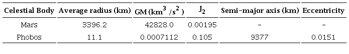 Let us consider Mars, Phobos and the spacecraft masses being m1, m2 and m3, respectively. The bodies M1, M2, and M3 move in the same plane, and the bodies M1 and M2 rotate around their center of mass in elliptical orbits, due only to the gravitational attraction between them. The body M3 travels around the bodies M1 and M2, influenced by their gravity fields, but it does not interfere with the motion of the primaries. Besides those Keplerian gravity forces, the non-spherical shapes of Mars and Phobos are also considered, expressed by the usual terms J2 of their gravity fields (Sanchez et al. 2009). It represents the flattening of the body. The equations of motion are shown in equations 1 and 2.