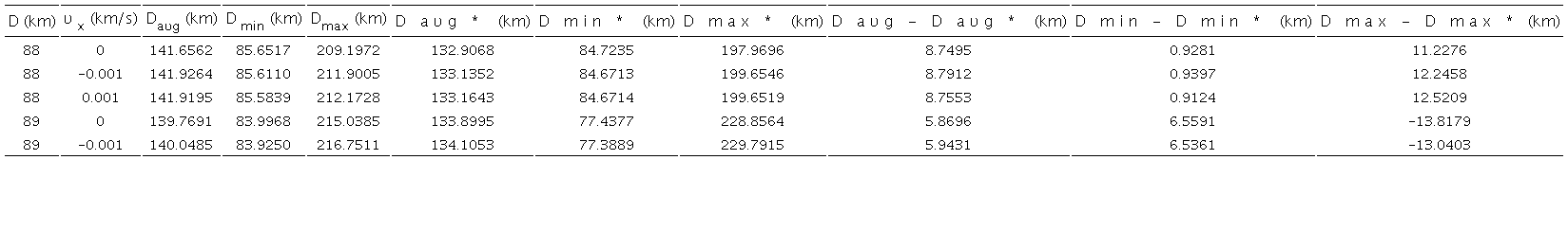 Another aspect to be considered when looking at the effects of using a simplified model for the problem is to see what happens when the search for the orbits is made using the simple model from the beginning. In this case, the results would be different and the initial conditions of the orbits with smaller values for Dmax would be different. Table 3 shows the results, with a comparison with the same orbits obtained using the better model. It is clear that different initial conditions are found. Using the better model, the initial conditions for the orbit with minimum Dmax are D = 88 km and υx =0km/s, with a maximum distance spacecraft-Phobos of 209.2972 km after 30 days. Using the circular and spherical model, the initial conditions for the orbit with minimum Dmax are D = 86 km and υx =0km/s, with a maximum distance spacecraft-Phobos of 188.3397 km after 30 days. Then, refining this orbit with the better model, the maximum distance spacecraft-Phobos goes to 213.1525 km after 30 days. Table 3 shows this analysis for the five orbits with smaller Dmax (km) assuming υy = −0.02 km/s, a circular orbit for Phobos and a spherical model for the bodies, for a simulation time of 30 days. Equivalent results for the better model (elliptical and flat bodies) are represented by . It is seen that the errors are in the range 25 to 54 km. It is also noted that the values for Dmax − are always negative, which means that the circular and spherical model always underestimates the value of Dmax for the orbits closer to Phobos, which is an important conclusion.