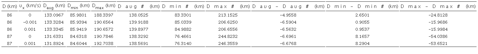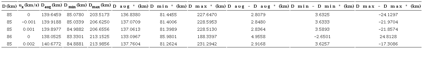 The next step is to evaluate the influence of the initial position of Phobos in its orbit around Mars, which is one of the goals of the present research. To perform this task, simulations are made assuming now that Phobos is in the apoapsis of its orbit around Phobos. Figure 6 and Table 5 show the results. Figure 6 is clearly different from Figure 2, which indicates the importance of the initial position of Phobos in these orbits. The large reduction of ranges of initial conditions that generate orbits with smaller maximum distances is noted. The range for maximum distances below 690 km is much larger in Figure 2(b) (blue and red regions), showing orbits with D in the range from 90 to 85 km that have maximum distances below 690 km, the majority of them with Dmax below 500 km. On the other hand, Figure 6(b) shows that only values of D < 87 km present orbits in this region, so restricting the range of initial conditions. The plots for the average distances have the same behavior. Differences in the behavior for the minimum distances are smaller, which means that the differences in the maximum distances are much more influenced by the initial position of Phobos in its orbit. Table 5 shows a more detailed comparison. The orbits with smaller maximum distances shown in Table 2 (Phobos initially at periapsis) have initial conditions with D = 88 or 89 km, υx of 0 or ±0.001 km/s and values of maximum distances in the interval 209 to 217 km. Table 5 (Phobos at apoapsis) shows initial conditions with D = 85 or 86 km, υx of 0, ±0.001 or 0.002 km/s and values of maximum distances in the interval 203 to 214 km. A summary of the conclusions shows that Phobos at periapsis gives a large range of initial conditions for orbits with relatively smaller values of the maximum distance, but the values are a little higher compared to the situation when it is at the apoapsis.