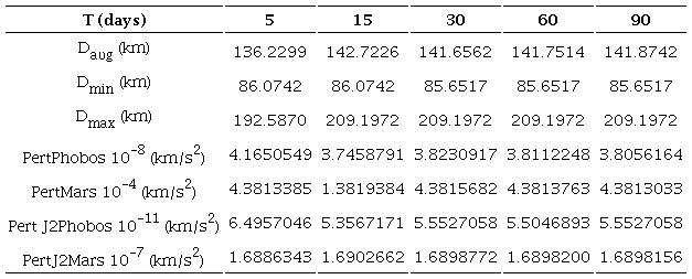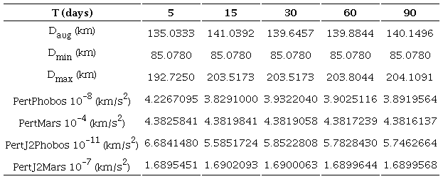 To gain an idea of the temporal evolution of the orbit, Table 4 presents the values of distances (km) and perturbations (km/s2) for the same set of initial conditions: Phobos at periapsis, D = 88 km, υx = 0, υy = −0.02 km/s, considering e = 0.0151, = 0.105 and = 1960.45 × 10−6 simulation times: 5, 15, 30, 60 and 90 days. A stabilization of all the values after 30 days is noted. PertPhobos, PertMars, PertJ2Phobos, PertJ2Mars represent the contributions of the Keplerian term of Phobos, the Keplerian term of Mars, the J2 term of Phobos and the J2 term of Mars, respectively, as measured by the integrals of the accelerations divided by the total integration time.